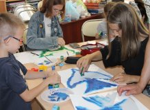 Ксения Гурченкова и Евгения Сотник научили ребят, как сделать трафареты с силуэтами животных, а затем по трафаретам формировали рисунок на новом листе бумаги: дети работали губкой, «набивая» контур и фон гуашью. Дети вдохновленно рисовали птиц, котиков и даже капибар!