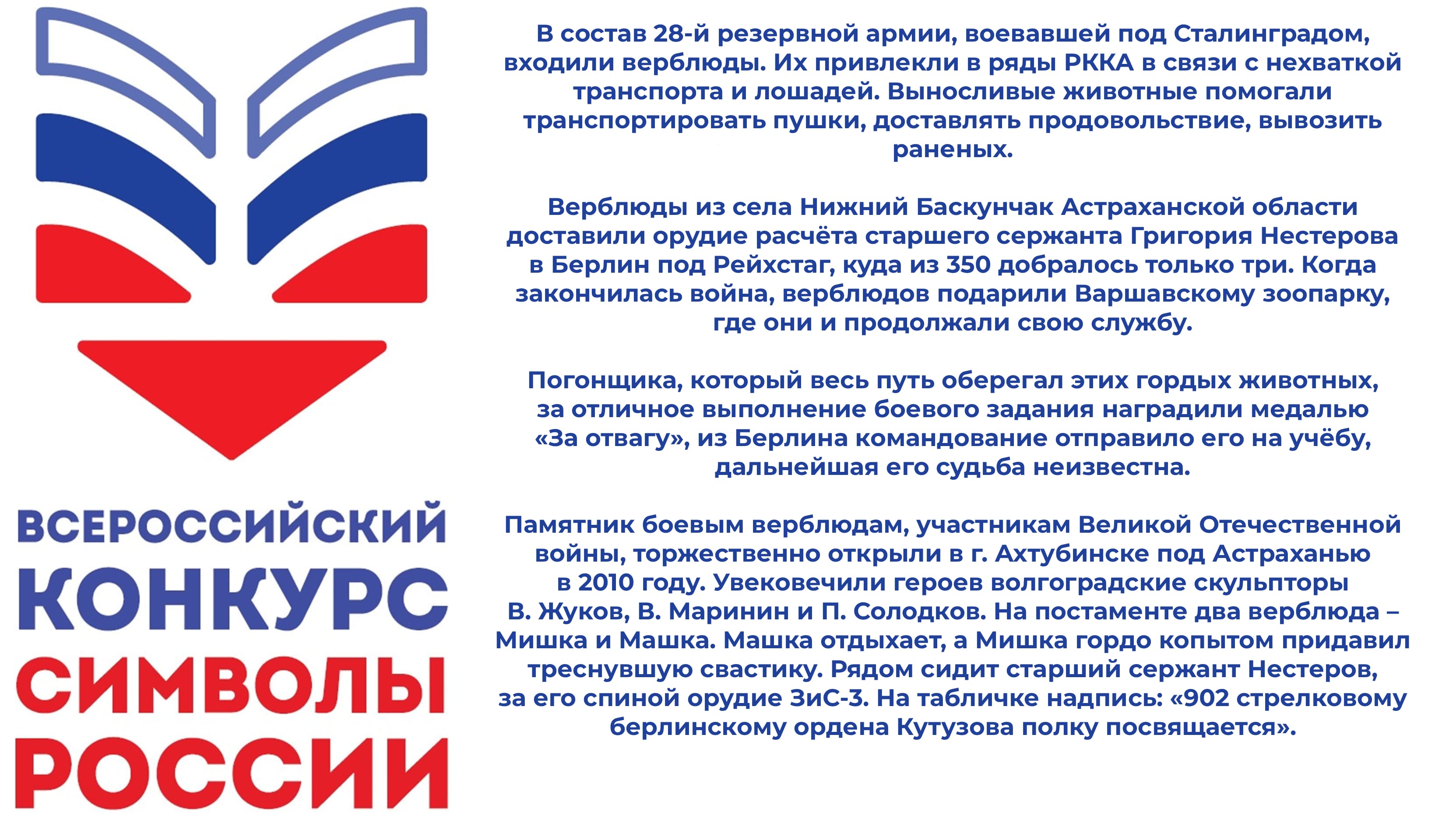 9. В состав 28-й резервной армии, воевавшей под Сталинградом, входили необычные животные, которым впоследствии возвели памятник в г. Ахтубинске в Астраханской области. Что это за животные? Почему их привлекали? Чем именно они занимались?